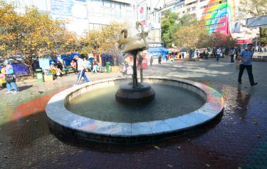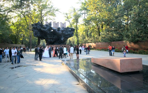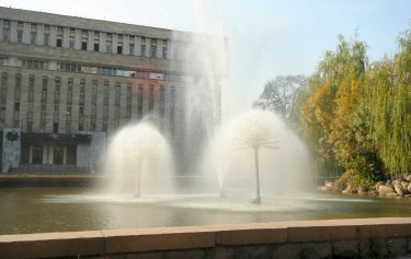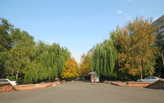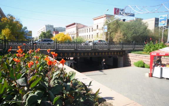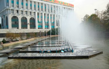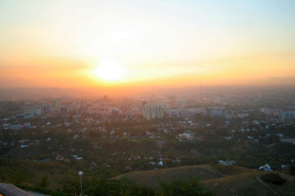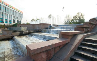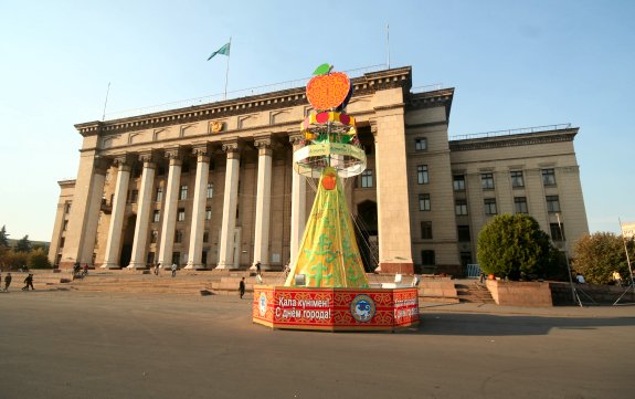 Jetzt aber noch ein paar Worte zu Almaty selbst: Die 'Apfelstadt' (so die deutsche Übersetzung, das russische Alma-Ata bedeutet 'Vater der Äpfel') ist auf jeden Fall einen Besuch wert und sie besticht vor allem mit ihrer angenehmen Atmosphäre - die vielen Bäume und Brunnen tragen dazu einiges Positives bei - und ihren freundlichen Menschen, auch wenn über eine Regionalsprache (in der Regel natürlich kasachisch) und russisch hinausgehende Sprachkenntnisse eher selten sind, so daß die Kommunikation zum Großteil auf nonverbalem Wege erfolgen muß. Zumindest die Orientierung ist in der 1,2-Millionen-Stadt denkbar einfach, denn das eigentliche Zentrum ist auf geschätzte 3 x 3 Kilometer beschränkt, in denen es fast nur senkrecht zueinander verlaufende Straßen gibt, deren wichtigere man sich schnell eingeprägt hat. Besonders vereinfacht wird das Zurechtfinden dadurch, daß Almaty übrigens selbst auch noch auf 800 Meter Höhe am Fuße des Tianschan-Gebirges liegt, was dazu führt, daß es von Süden nach Norden ein leichtes Gefälle gibt, an dem man seine grundsätzliche Richtung leicht immer leicht feststellen kann.